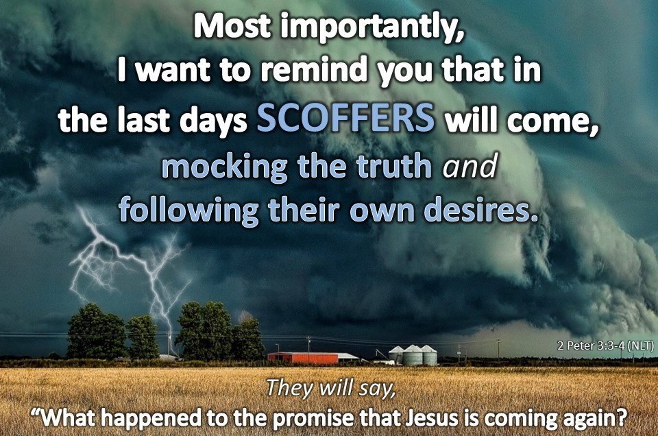Above all, you must understand that in the last days scoffers will come, scoffing and following their own evil desires. 4 They will say, “Where is this ‘coming’ he promised? Ever since our ancestors died, everything goes on as it has since the beginning of creation.” 5 But they deliberately forget that long ago by God’s word…