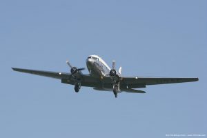 Douglas DC-3, C-47B N47E (5), Dynamic Aviaiton’s ‘Miss Virginia’, approaching Bridgewater Airpark, VA, 8-10
