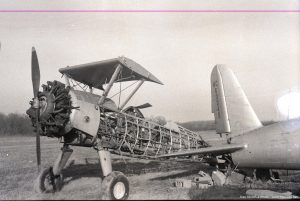 Stearman, USAF government surplus at Stoltzfus Airfield, Coatesville, PA, 1940’s. Father bought 12 of them for a few hundred dollars each. That’s the tail of a Vultee BT-13.
